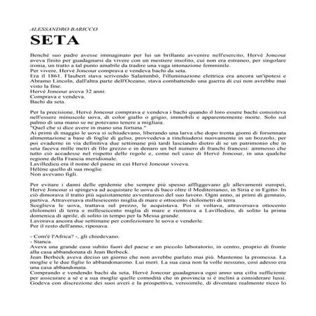 "Mio signore amato":la lettera scritta da Alessandro Baricco La lettera che state per leggere è tratta da "Seta", uno dei più bei romanzi di Alessandro Baricco. Mio signore amato, non aver paura, non muoverti, resta in silenzio, nessuno ci vedrà, rimani così, ti voglio guardare, io ti ho guardato tanto ma non eri per me, adesso sei per me, non avvicinarti, ti prego, resta come sei, abbiamo una ... Seta di Baricco: spiegazione e riassunto - Studenti.it SETA BARICCO: RIASSUNTO. Svolgimento e commento. " Per vivere, Hervé Joncour comprava e vendeva bachi da seta .". E' la storia di questo insolito personaggio che abita in un paesino con l'amata moglie. Era il 1861 e Hervé viveva in un paesino nel sud della Francia chiamato Lavilledieu. Il suo lavoro consisteva nel comprare bachi da ... Seta di Alessandro Baricco: trama e spiegazione | Studenti.it Seta è un romanzo dello scrittore torinese Alessandro Baricco pubblicato nel 1996. Racconta la storia di un commerciante di seta francese che, a causa di un' epidemia che colpisce i bachi da ... Seta - Alessandro Baricco - Recensioni di QLibri La vita scorre per il giovane uomo fino ad una lettera scritta in giapponese. ... Come tutti i racconti di Baricco, Seta è un racconto breve ma nello stesso tempo intenso ed enigmatico. Comprendere Baricco non è semplice, bisogna immedesimarsi nei suoi racconti e nei suoi personaggi. Solo così si è in grado di comprendere le sue storie.